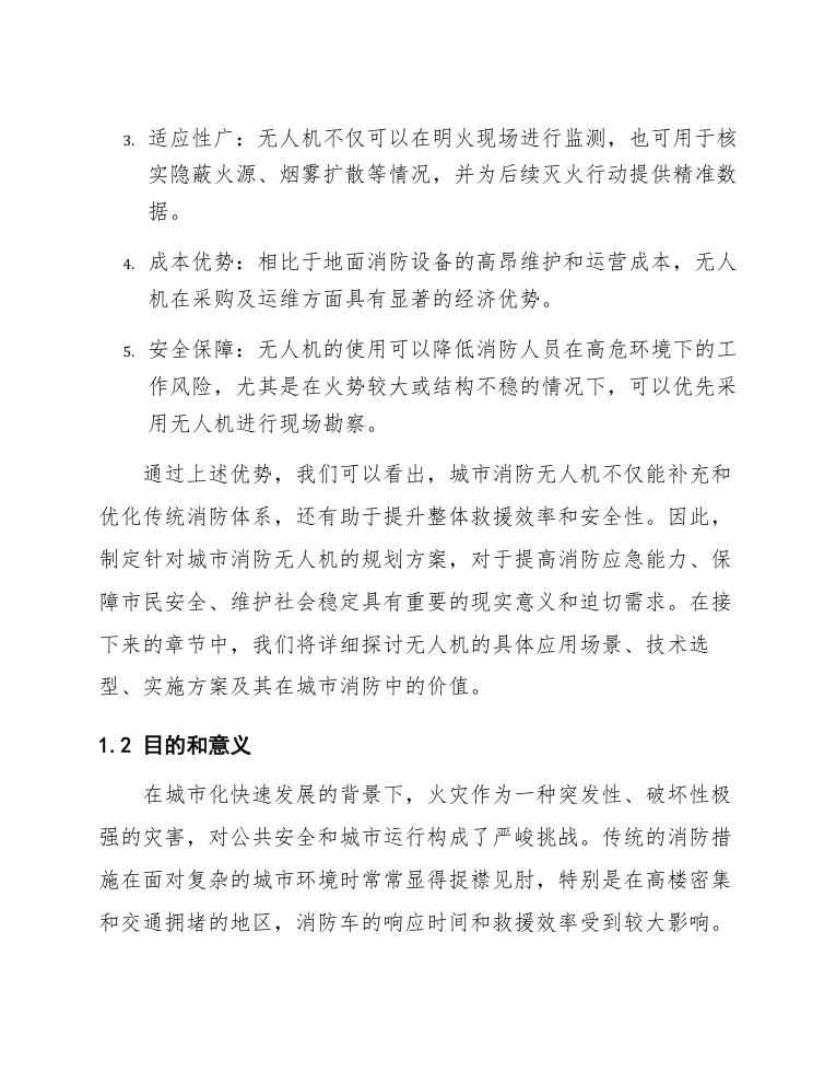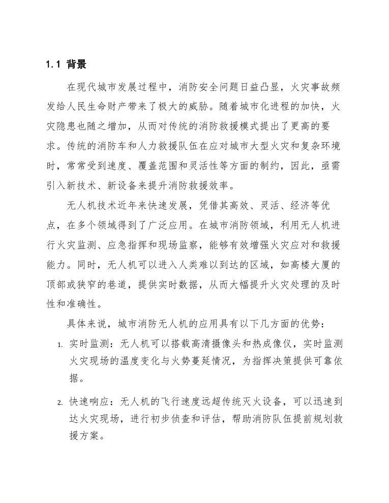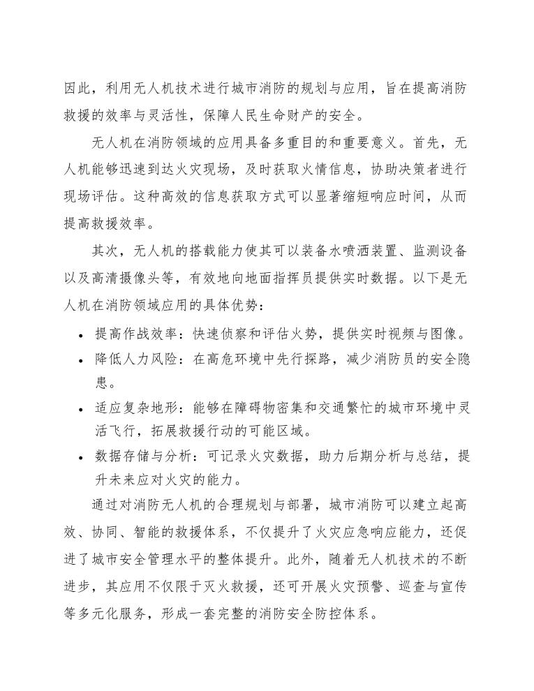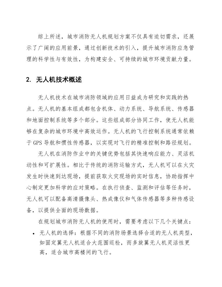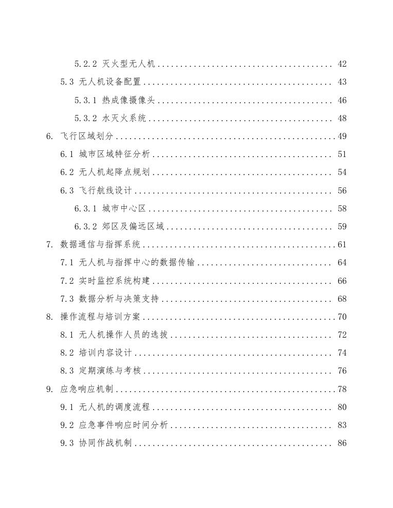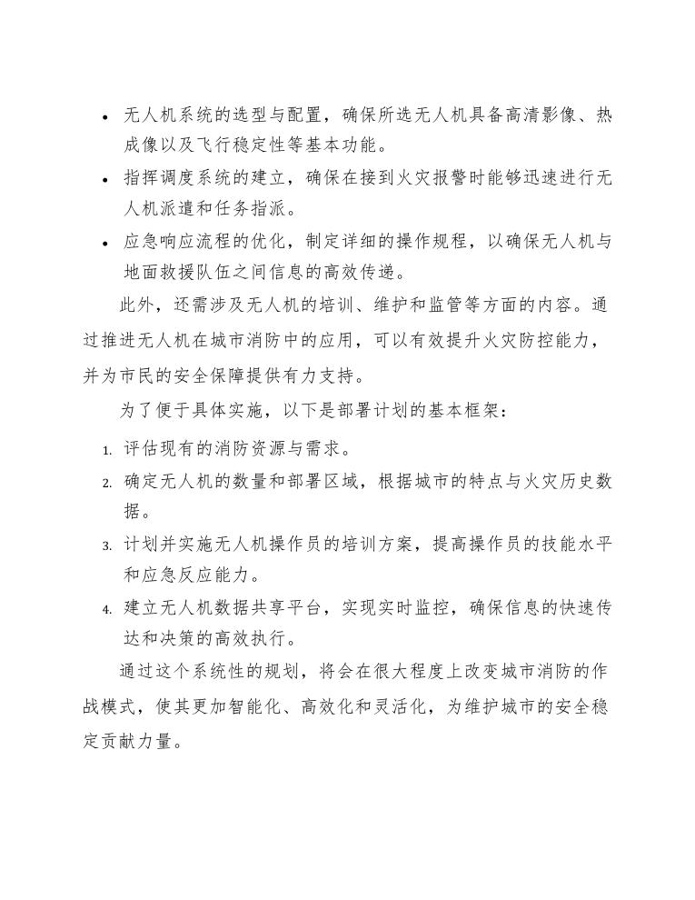 此外,还需涉及无人机的培训、维护和监管等方面的内容。通过推进无人机在城市消防中的应用,可以有效提升火灾防控能力,并为市民的安全保障提供有力支持。