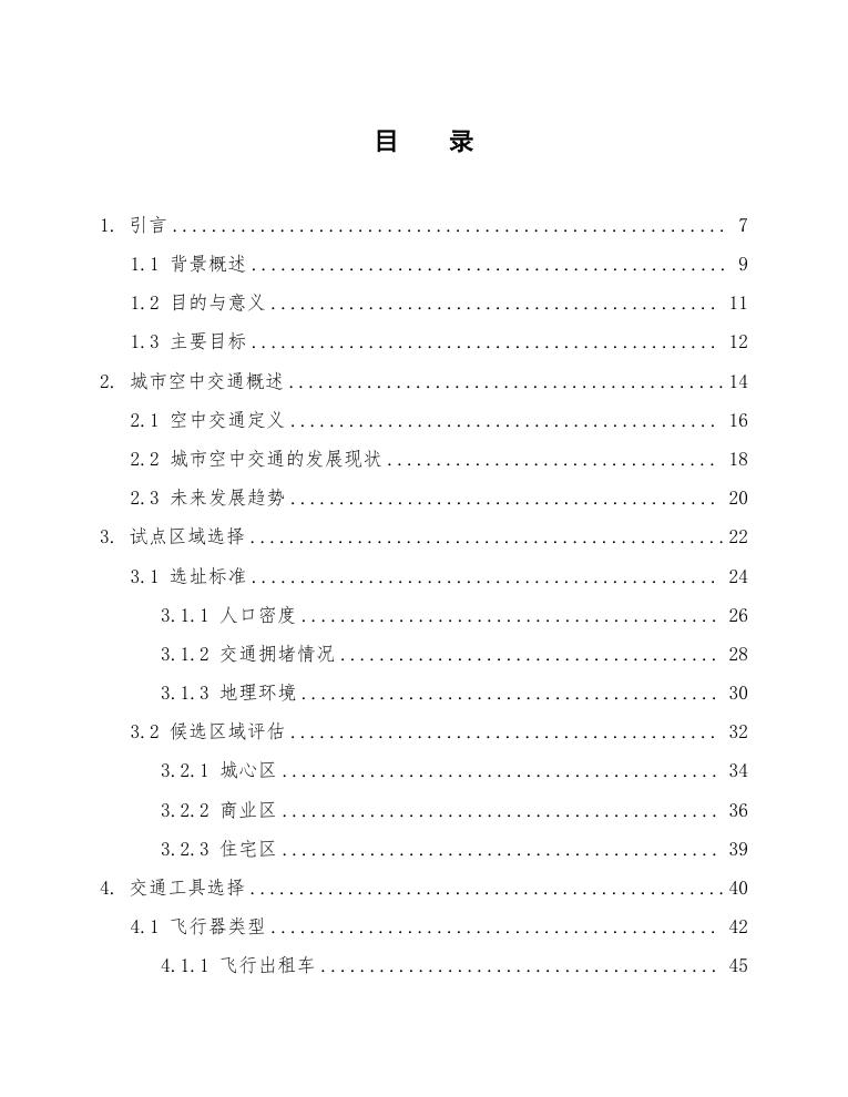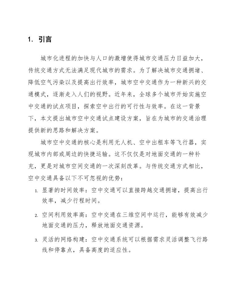 在现代城市化进程加快与交通问题日益严重的背景下,城市空中交通的建设具备了重要的现实意义和广阔的发展前景。本文提出的城市空中交通试点建设方案,旨在通过引入创新的空中交通运输模式,缓解城市交通压力、提升市民出行效率和改善城市环境。