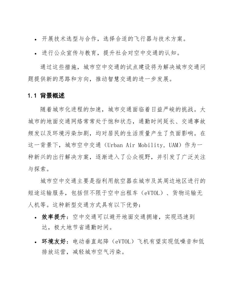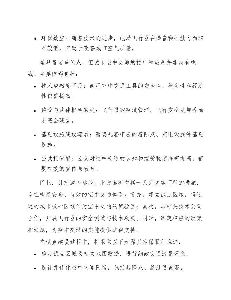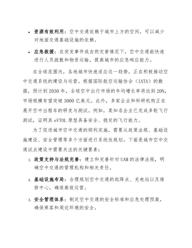 通过以上措施的有效结合,城市空中交通试点建设将为解决城市交通拥堵、提高城市运作效率、提升市民出行体验提供有力支持,最终实现更绿色、更智能的城市交通体系。