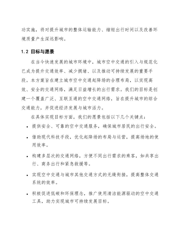 在当今快速发展的城市环境中,城市空中交通的引入与规范化已成为提升交通效率、减少拥堵、以及推动可持续发展的重要手段。本方案旨在建立城市空中交通起降场的合理布局,以实现高效、安全的交通网络,满足日益增长的出行需求。我们的目标是创建一个覆盖广泛、互联互通的空中交通网络,旨在提升城市的综合交通能力,并促进经济发展与城市活力。