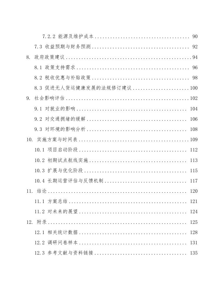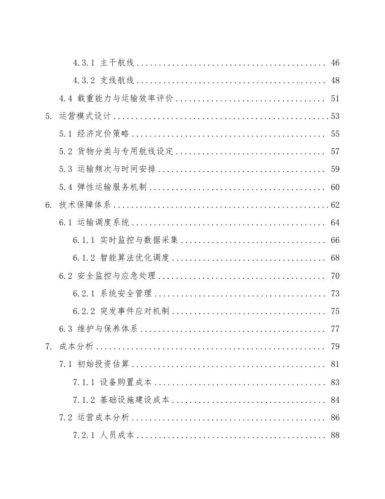 为确保网络规划的可行性和有效性,方案还将评估无人货运的安全性和经济性,包括对无人运输设备的选型、运行成本的分析和安全监管措施的制定。无人运输车辆的选型将考虑载重能力、能源效率及其在各种天气条件下的运行可靠性。同时,将对经济效益进行量化,设计运营模式,以确保投资回报率和社会效益的最大化。
