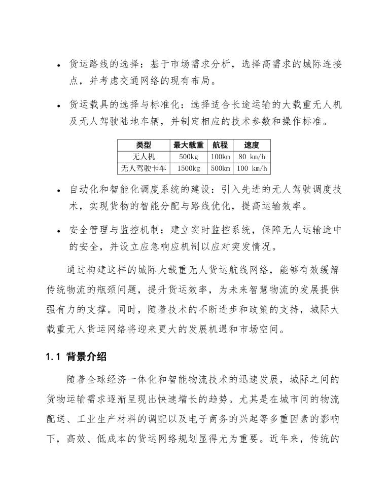 - 运输工具的适应性:选用适合城际运输的大载重无人货运工具,以符合市场需求和运输环境的变化。