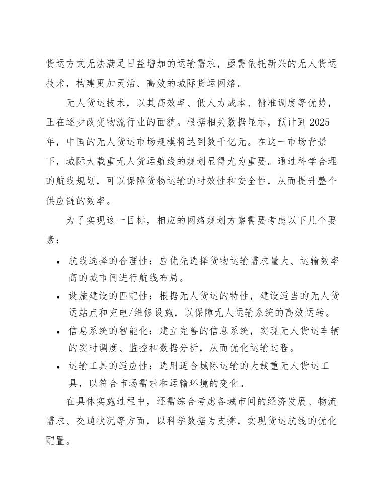 综上所述,本文提出的城际大载重无人货运航线网络规划方案,围绕市场需求及现有挑战,通过科学的航线布局、经济效益分析、技术支持与管理体系建设,旨在为未来物流运输的高效、经济和安全提供解决方案。