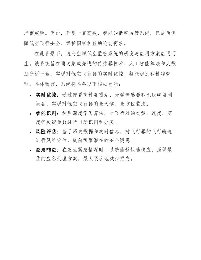综上所述,边海空域低空监管系统的研发与应用不仅能够提升低空飞行活动的安全性和效率,还能够促进相关产业链的发展,具有重要的战略意义和现实价值。通过该项目的实施,将为我国低空空域的开放和管理提供强有力的技术支撑,推动通用航空产业的健康发展。