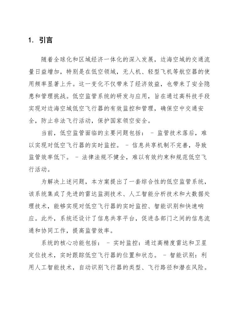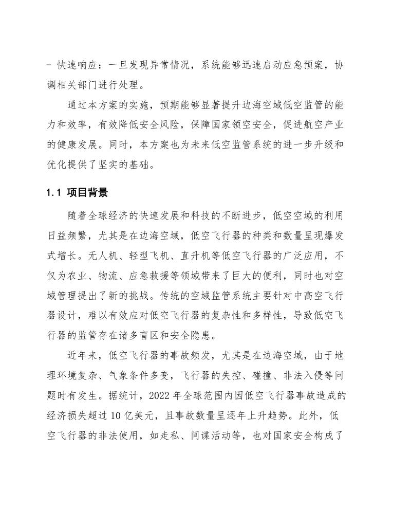 通过本方案的实施,预期能够显著提升边海空域低空监管的能力和效率,有效降低安全风险,保障国家领空安全,促进航空产业的健康发展。同时,本方案也为未来低空监管系统的进一步升级和优化提供了坚实的基础。