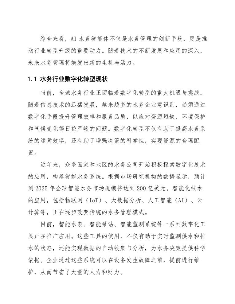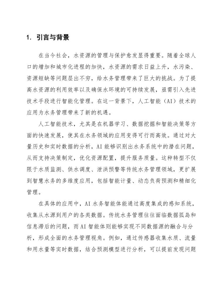 人工智能技术,尤其是在机器学习、数据挖掘和智能决策等方面的快速发展,使其在水务领域的应用变得可行而高效。通过对大量历史和实时数据的分析,AI能够识别出水务系统中的潜在问题,从而支持决策制定,优化资源配置,提升服务质量。这种转型不仅限于水质监测、供水调度、泄洪预警等传统水务管理领域,更扩展到智慧水务的多维度应用,包括智能计量、动态负荷预测和精细化管理。