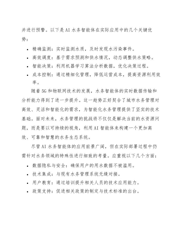 随着5G和物联网技术的发展,水务智能体的实时数据传输和分析能力得到了进一步提升。这一趁势正好契合了城市水务管理对高效、灵活和智能化的需求,为智能化水务管理提供了坚实的技术基础。面对未来,水务管理的挑战将不仅仅是解决当前的水资源问题,而是要以可持续的视角,利用AI智能体来构建一个更加高效、可靠和智慧的水务生态系统。