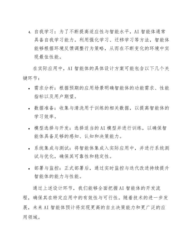 通过上述设计环节,我们能够全面把握AI智能体的开发流程,确保其在特定应用中的有效性与可行性。随着技术的进一步发展,未来AI智能体预计将实现更高的自主决策能力和更广泛的应用领域。