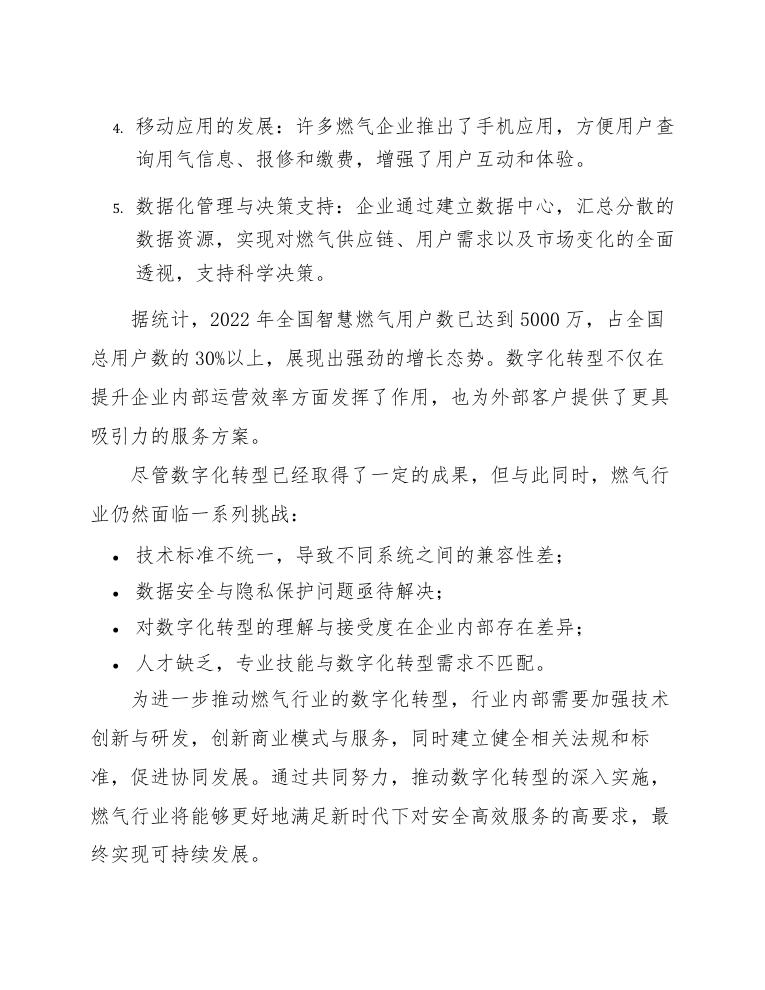 为进一步推动燃气行业的数字化转型,行业内部需要加强技术创新与研发,创新商业模式与服务,同时建立健全相关法规和标准,促进协同发展。通过共同努力,推动数字化转型的深入实施,燃气行业将能够更好地满足新时代下对安全高效服务的高要求,最终实现可持续发展。