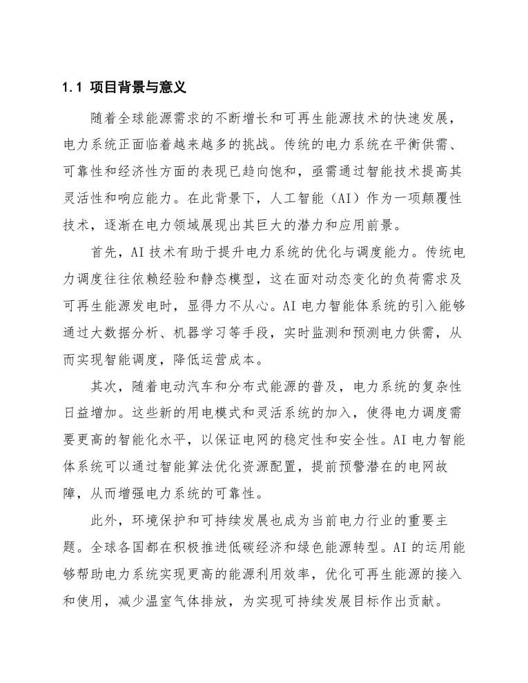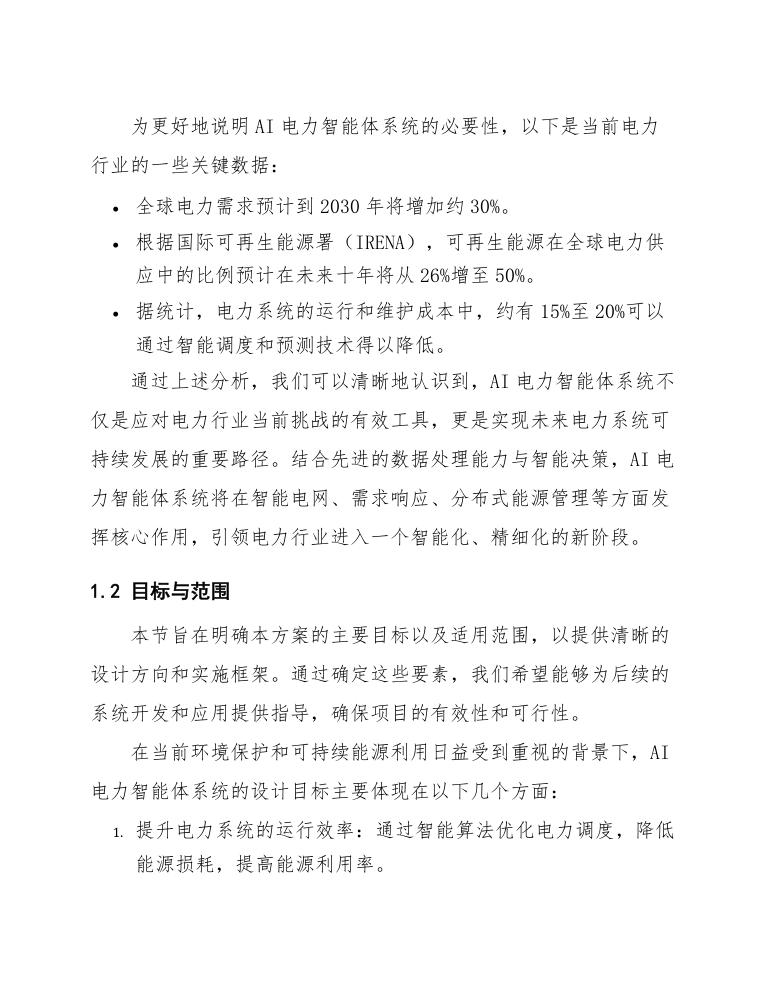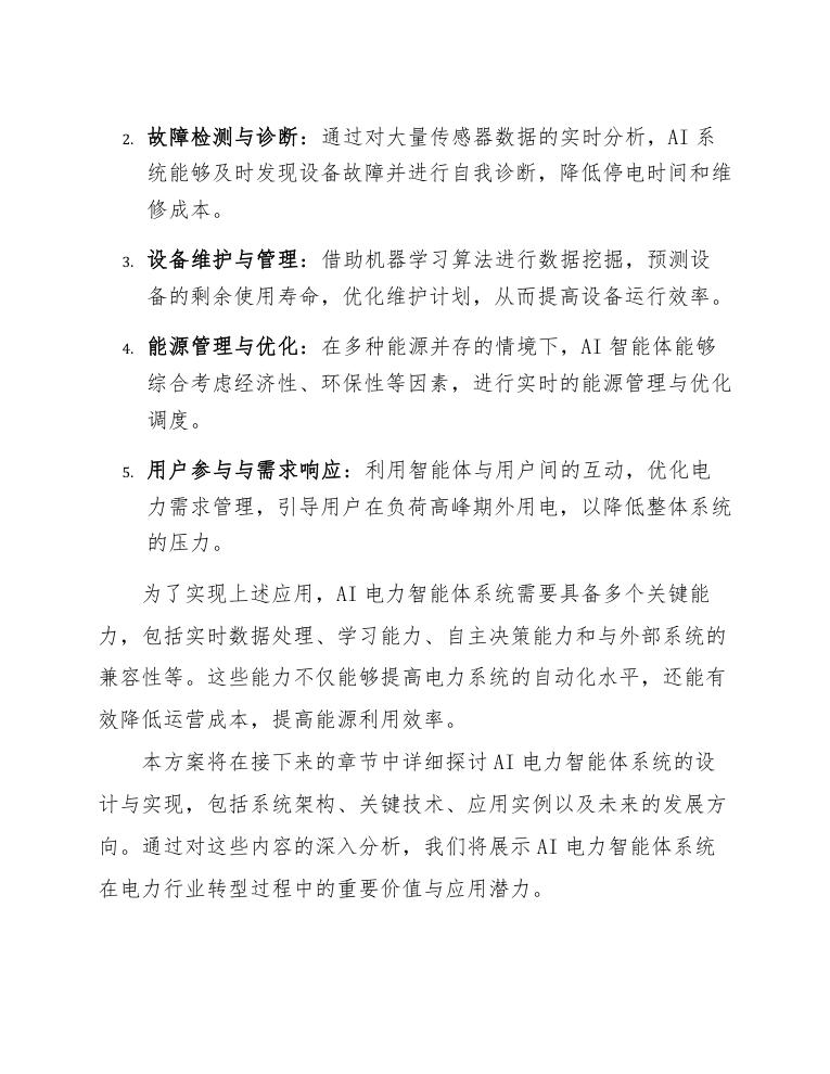 通过详细的需求分析和系统设计,我们相信,AI电力智能体系统能够在提高电力系统运行效率、减少能耗及降低运行成本方面发挥重要作用,为实现更加智能、绿色和可持续的电力供应提供坚实的技术保障。