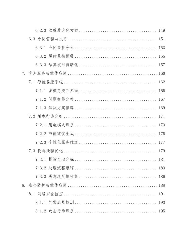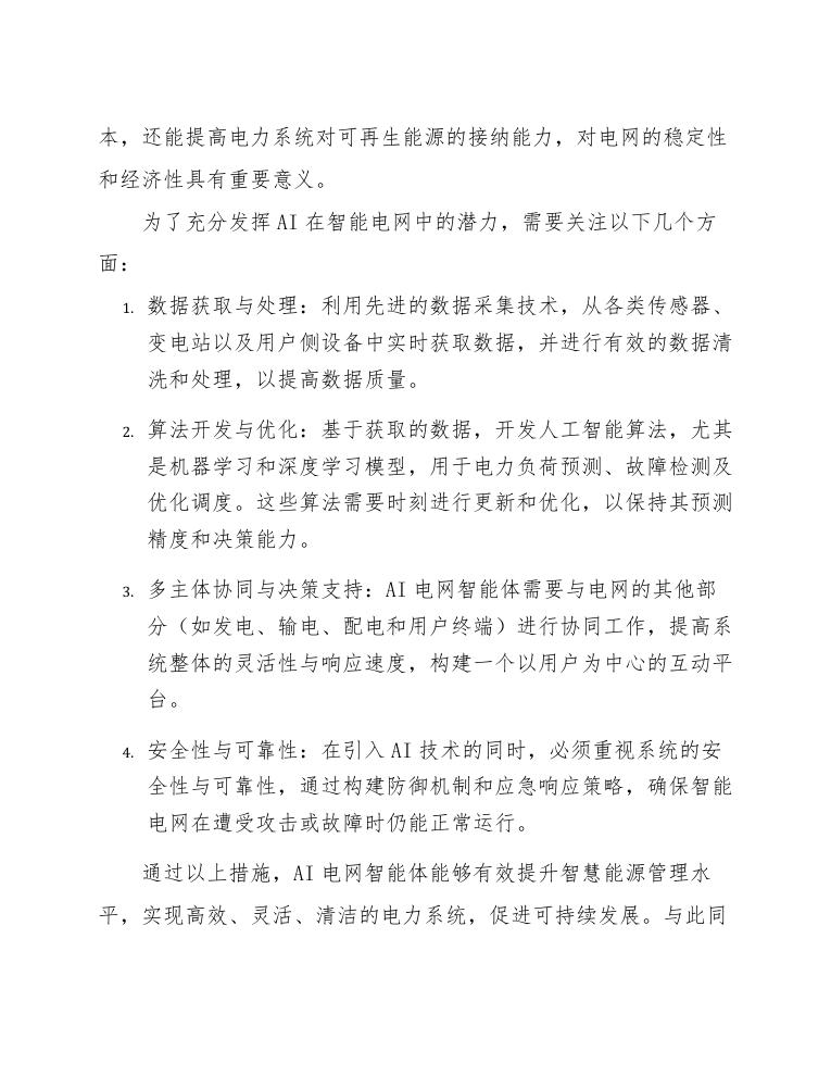 通过以上措施,AI电网智能体能够有效提升智慧能源管理水平,实现高效、灵活、清洁的电力系统,促进可持续发展。与此同时,这一研究领域也伴随着许多技术挑战,如如何保证数据隐私与安全、如何建立稳健的模型等,需要学术界与工业界的共同努力。