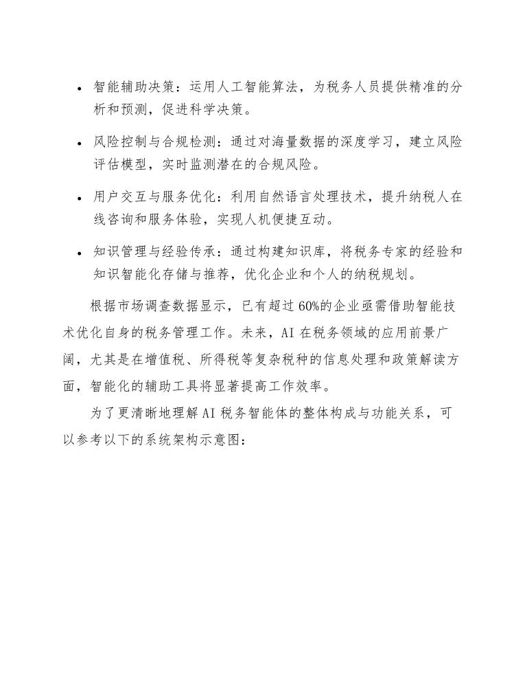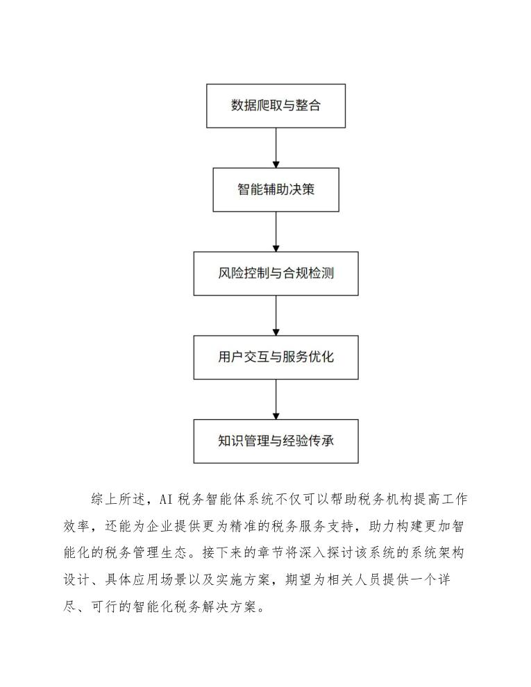 此外,以上功能将结合用户反馈和行为数据,进行不断迭代与优化。通过深度学习和用户画像技术,税务智能体将能够逐渐完善个性化服务,更好地满足不同用户的需求。