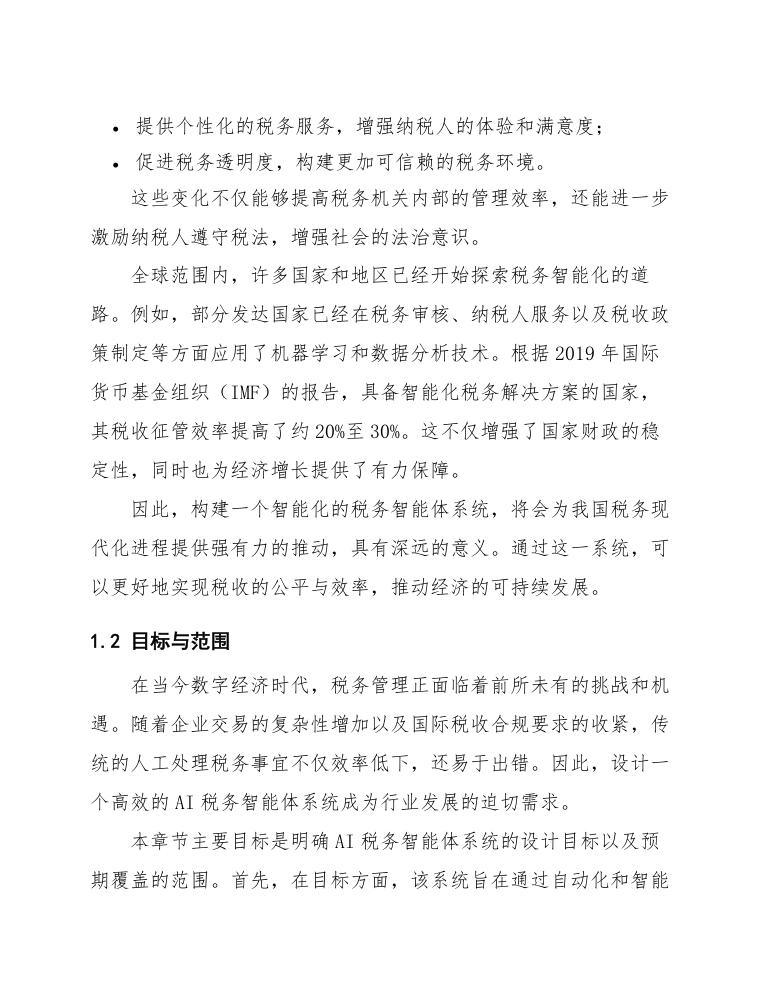 本章节主要目标是明确AI税务智能体系统的设计目标以及预期覆盖的范围。首先,在目标方面,该系统旨在通过自动化和智能分析,提高税务处理的效率及准确性,从而帮助企业降低税务风险,并提高合规能力。系统将集成自然语言处理、机器学习算法和数据分析,以便在海量财务数据中提取出有价值的税务信息,支持决策制定。