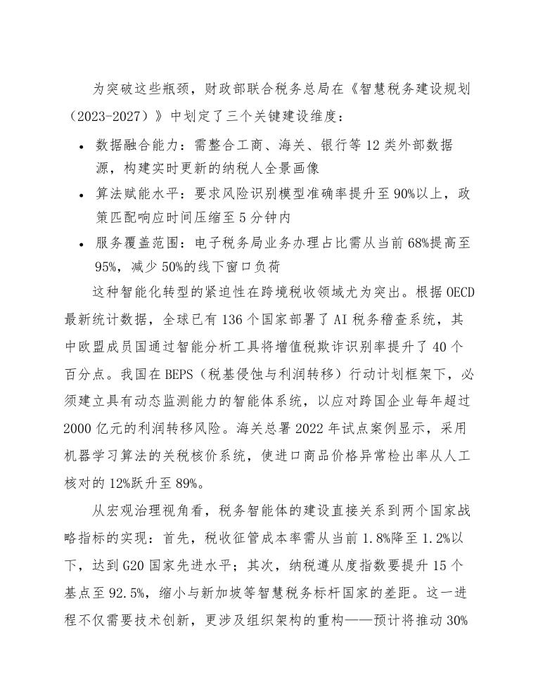 技术演进正在重塑税务治理范式,Gartner研究指出,到2026年将有45%的税务机关采用AI驱动的实时征税系统。但需注意的是,技术落地仍面临数据孤岛(35%机构存在系统割裂)、算法透明度(仅28%模型通过审计认证)等挑战。未来三年,随着多模态学习和小样本学习技术的成熟,AI税务系统将逐步实现从"辅助决策"到"自主治理"的跨越,最终构建起全球协同的智能税收治理网络。