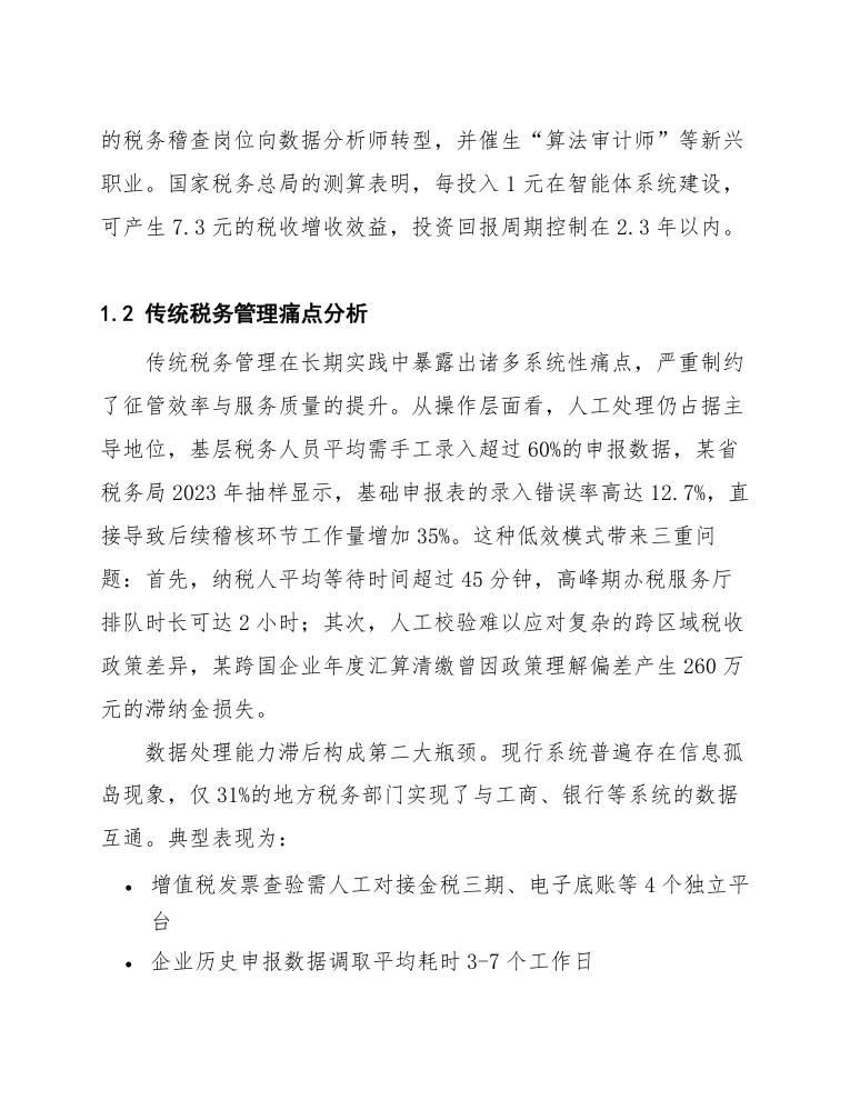 随着数字经济时代的全面到来,税务管理智能化已成为国家治理体系现代化的核心支柱。近年来,国务院发布的《关于进一步深化税收征管改革的意见》明确提出,到2025年要实现从“以票管税”向“以数治税”的跨越式转型。这一战略目标的背后,是国家对税收治理效能的深层次需求:一方面,2023年全国税收收入达15.6万亿元,占财政收入比重超过80%,税务系统的精准性和响应速度直接影响国家财政安全;另一方面,金税四期工程的推进暴露出传统人工管理模式的三重短板——跨部门数据协同效率低下(平均业务处理耗时72小时)、风险识别覆盖率不足(仅能监测35%的涉税异常行为)、政策执行偏差率较高(基层税务机关政策解读差异达22%)。