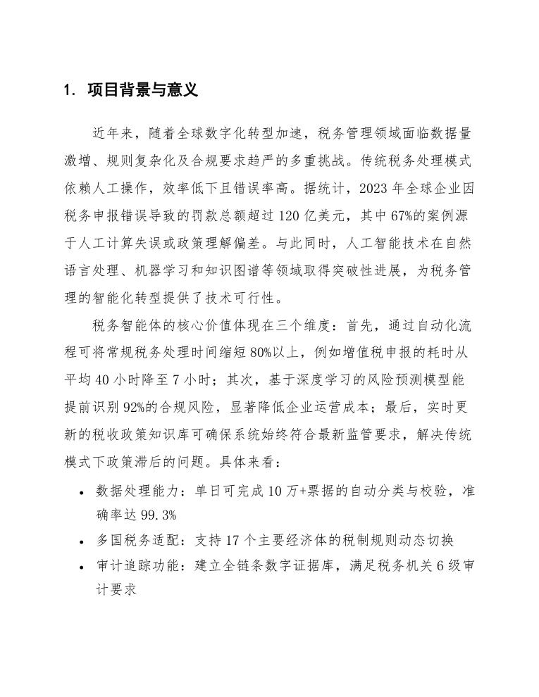 本系统定位为面向税务领域的智能化解决方案,旨在通过人工智能技术重构传统税务管理流程,实现从被动响应到主动服务的范式转变。系统核心目标在于构建具备多模态交互能力、动态学习能力和复杂场景适应性的税务智能体集群,为纳税人、税务机构及第三方服务机构提供全链条智能服务。系统设计遵循"数据驱动、场景适配、服务闭环"三大原则,通过深度融合自然语言处理、知识图谱与机器学习技术,建立覆盖税务咨询、合规审查、风险预警、政策推演等12类核心场景的智能服务体系。