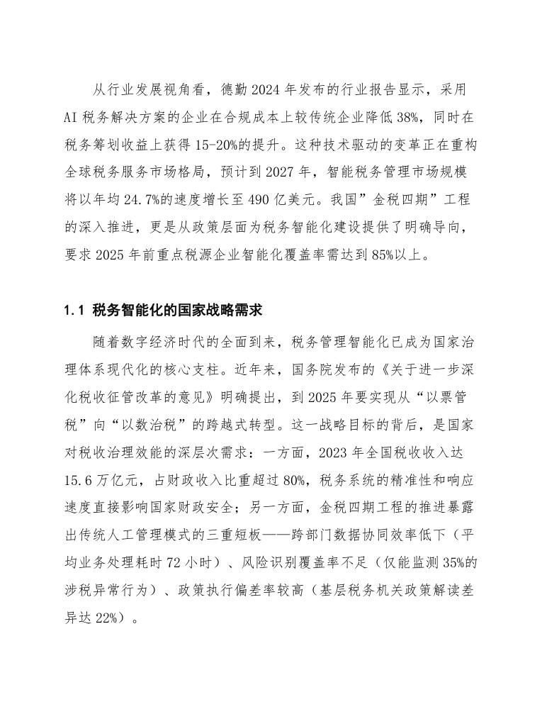 从行业发展视角看,德勤2024年发布的行业报告显示,采用AI税务解决方案的企业在合规成本上较传统企业降低38%,同时在税务筹划收益上获得15-20%的提升。这种技术驱动的变革正在重构全球税务服务市场格局,预计到2027年,智能税务管理市场规模将以年均24.7%的速度增长至490亿美元。我国"金税四期"工程的深入推进,更是从政策层面为税务智能化建设提供了明确导向,要求2025年前重点税源企业智能化覆盖率需达到85%以上。