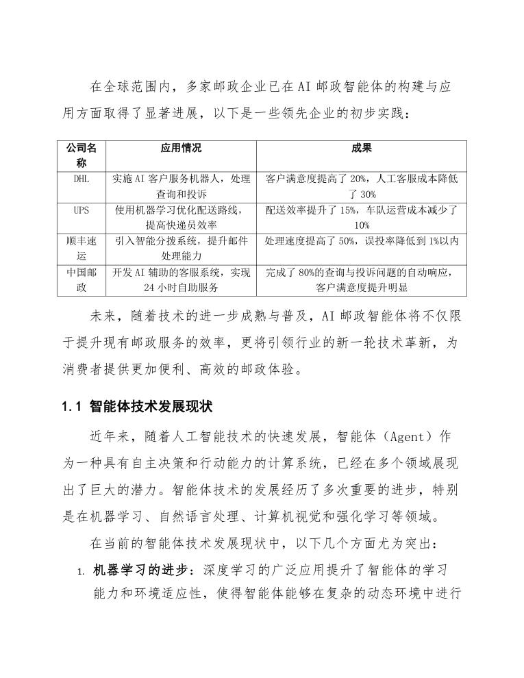 在全球范围内,多家邮政企业已在AI邮政智能体的构建与应用方面取得了显著进展,以下是一些领先企业的初步实践: