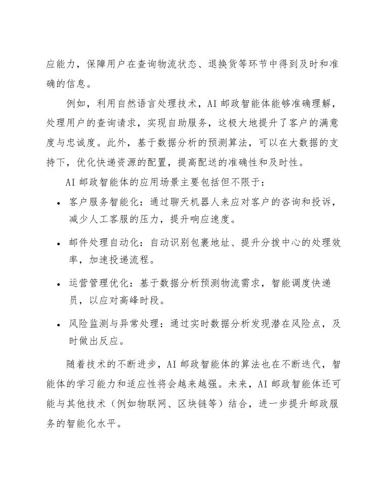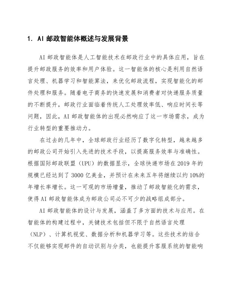 未来,随着技术的进一步成熟与普及,AI邮政智能体将不仅限于提升现有邮政服务的效率,更将引领行业的新一轮技术革新,为消费者提供更加便利、高效的邮政体验。