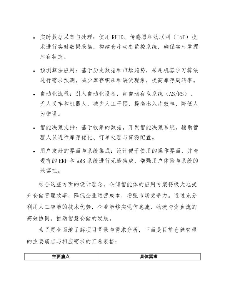 为了更全面地了解项目背景与需求分析,下面是目前仓储管理的主要痛点与相应需求的汇总表格:
