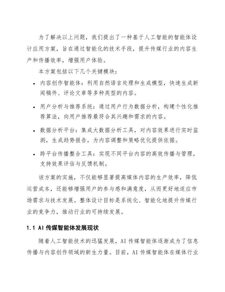 为了解决以上问题,我们提出了一种基于人工智能的智能体设计应用方案,旨在通过智能化的技术手段,提升传媒行业的内容生产和传播效率,增强用户体验。