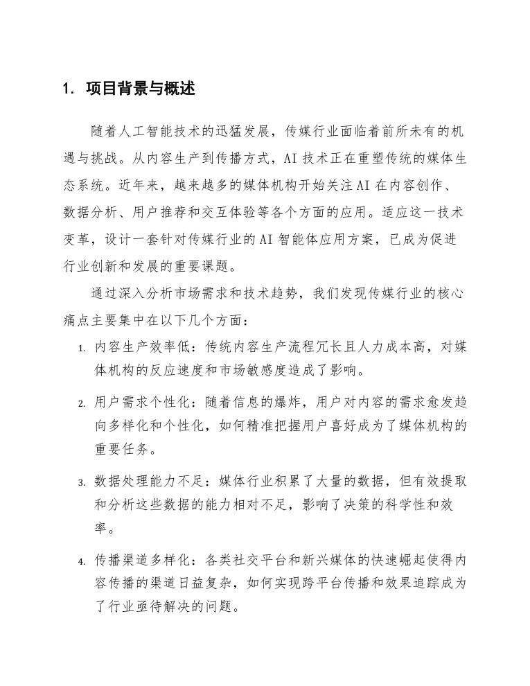 该方案的实施,不仅能够显著提高媒体内容的生产效率,降低运营成本,还能够增强用户的参与感和满意度,从而更好地适应市场需求与技术发展。整体设计目标是系统化、智能化地提升传媒行业的竞争力,推动行业的可持续发展。