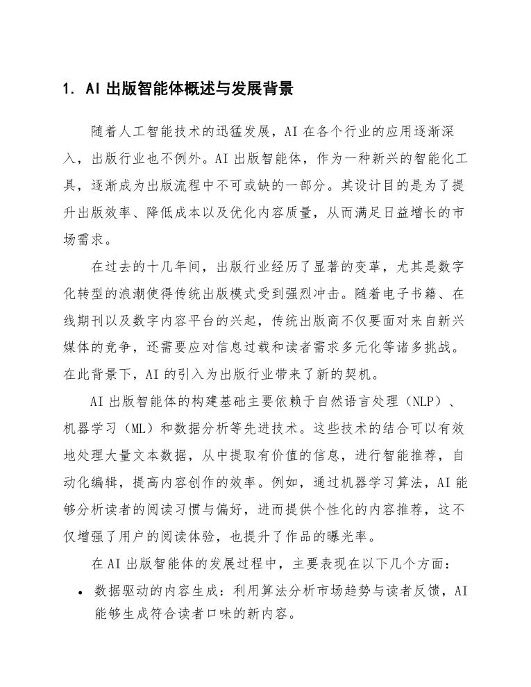随着人工智能技术的迅猛发展,AI在各个行业的应用逐渐深入,出版行业也不例外。AI出版智能体,作为一种新兴的智能化工具,逐渐成为出版流程中不可或缺的一部分。其设计目的是为了提升出版效率、降低成本以及优化内容质量,从而满足日益增长的市场需求。