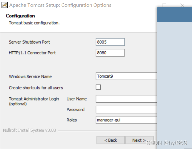 6.出现管理提示框,要求输入端口和管理密码,保持默认设置就行。默认的端口号就是8080,这里一般不用设置。点击Next。
