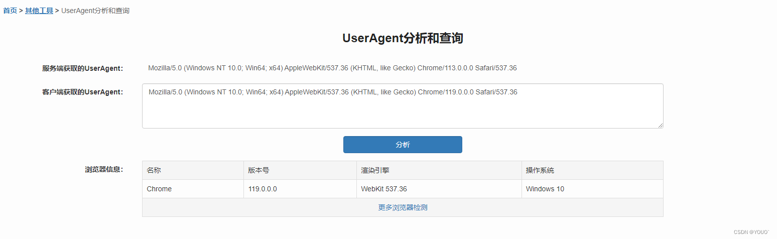 工具地址:UserAgent分析和查询 浏览器UA分析 UA查看 - 我查139查询网