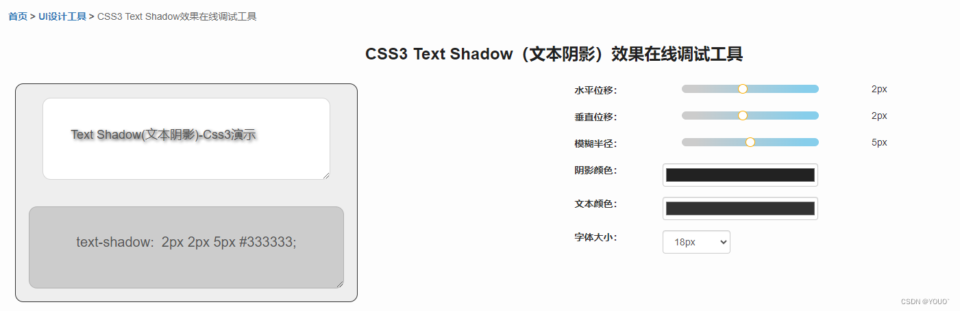 CSS文本阴影效果在线调试工具提供在线调试并预览css3 Text Shadow效果的工具。具有实时调试并显示预览效果的功能,同时能够实时生成对应的css3效果代码。