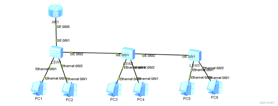 - 交换机之间相连的接口均改为trunk口,放行vlan 2 to 5
