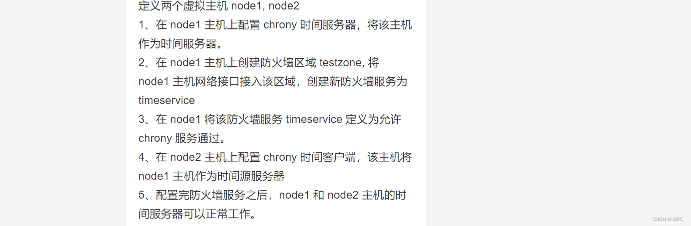 文章讲述了如何在两台虚拟机间配置时间服务器,具体包括在Node1上配置Chrony允许133节点同步,关闭防火墙并重启服务。接着在Node1上重新开启防火墙,将网络接口置于test区域,并创建timeservice服务,允许Chrony服务(端口123,UDP)通过。最后强调了由于网络接口区域设置,需将timeservice服务添加到test区。