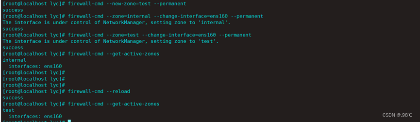 3.重新开启node1防火墙,将网络接口ens160接入新创建的test区域中