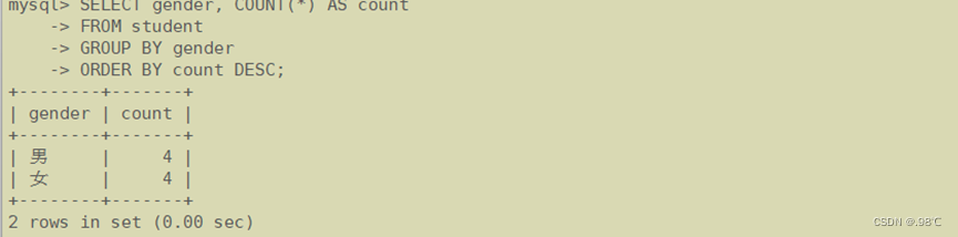 19、查询男生和女生分别有多少人,并将人数降序输出