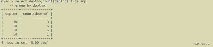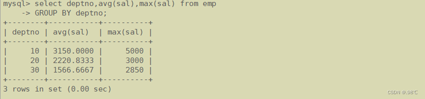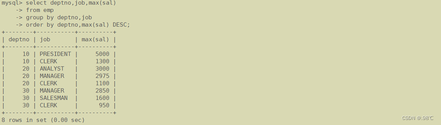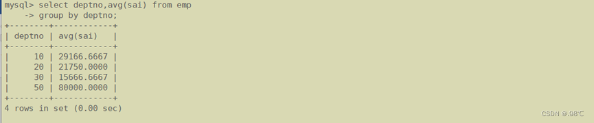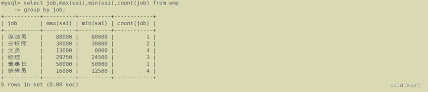 mysql> select job,max(sai),min(sai),count(job) from emp