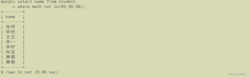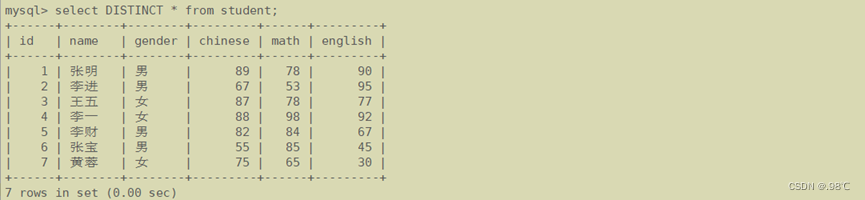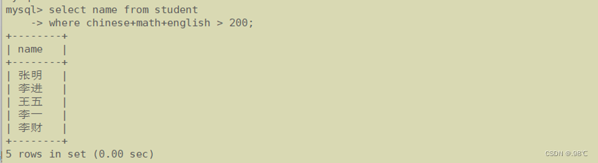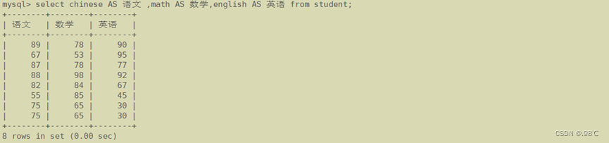 mysql> select chinese AS 语文 ,math AS 数学,english AS 英语 from student;