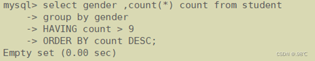 20、查询男生和女生分别有多少人,并将人数降序输出,并查询出大于9的性别人数信
