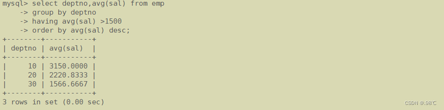 8、将部门平均薪水大于1500的部门编号列出来,按部门平均薪水降序排列