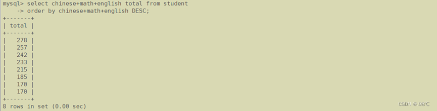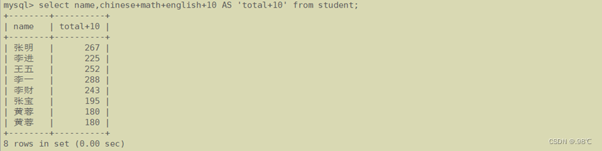 mysql> select name,chinese+math+english+10 AS 'total+10' from student;