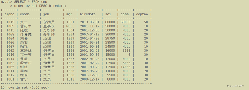 11. 查询所有员工详细信息,用工资降序排序,如果工资相同使用入职日期升序排序