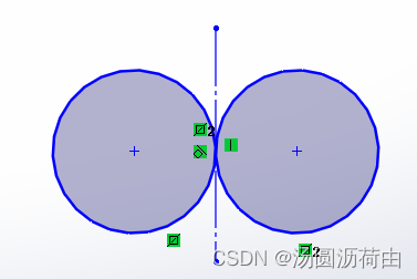 - 摁住Ctrl键选中两个圆以及构造线,设计树中弹出如图7所示的属性图,选择对称,结果如图12所示。