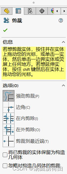 介绍:点击剪裁实体按钮,在设计树一栏出现剪裁属性图,其中最常用到的是强劲剪裁和剪裁到最近端。信息栏(即标黄字段)有功能介绍。