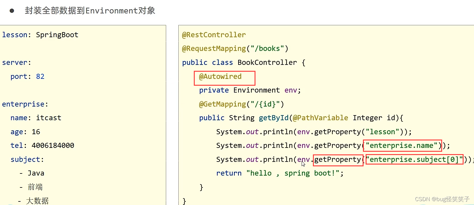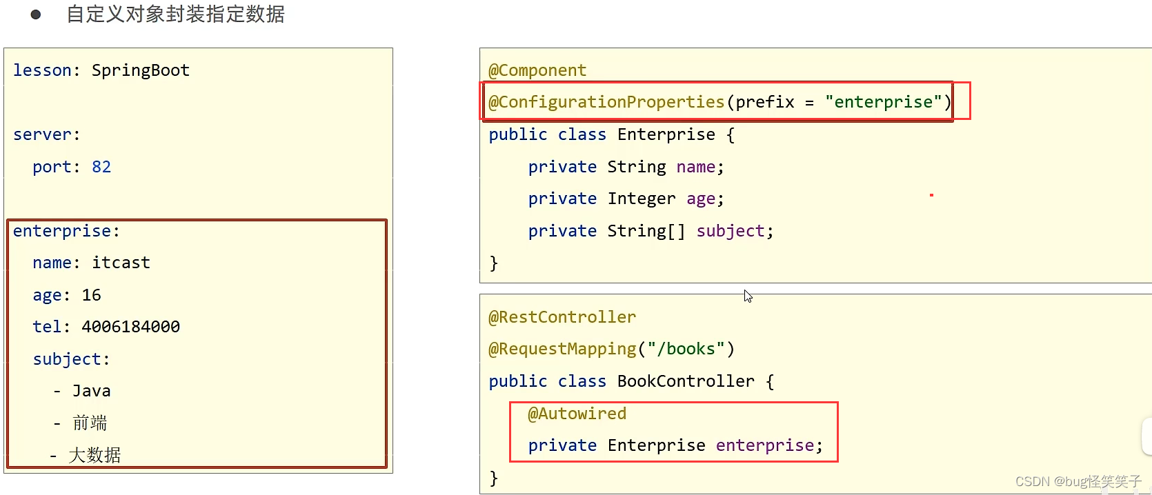 封装成pojo的实体类,加上@Component的注解,让spring能够加载到这个bean,在使用的地方都可以用@Autowired直接自动装配,其次加上@ConfigurationProperties(prefix = " 类型名 ")