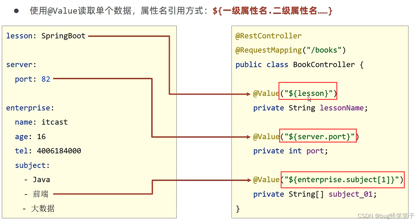 <1>使用@Value注解进行单个读取,多层级加 “ . ”