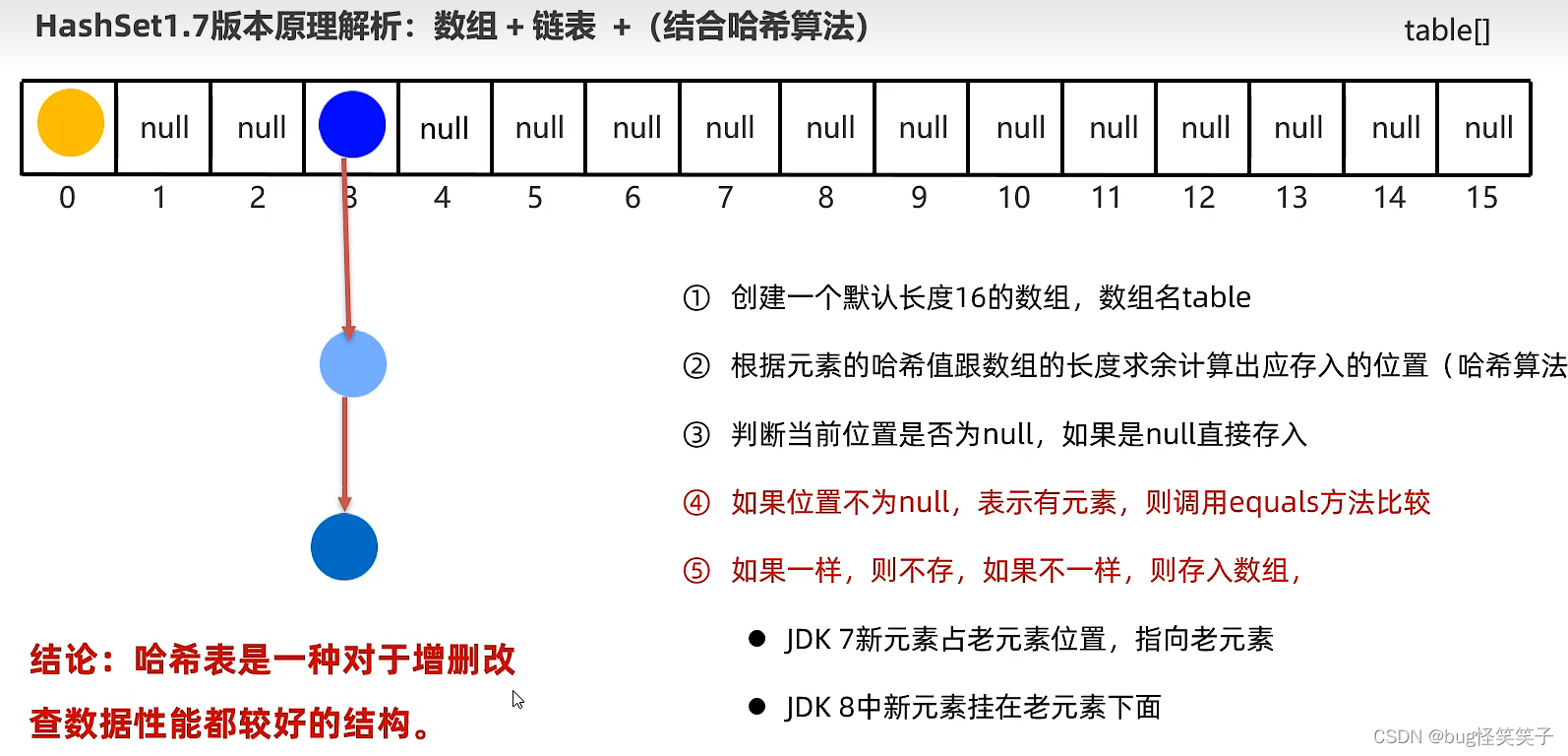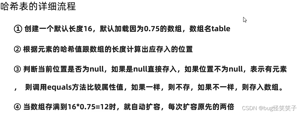 如何做到不重复呢?就用到了重写的HashCode和equals(),我们知道HashSet集合底层原理是基于哈希算法的数组和链表加红黑树,一开始先创建了长度为16的数组,我们存数据时首先算hash值然后除以数组长度取余,确定存放位置,然后用equals()方法比较数组位置的链表上是否有相同属性的数据啊,没有就存。而且不重写Hashcode导致内容相同的不同对象出现在set集合,导致有重复。