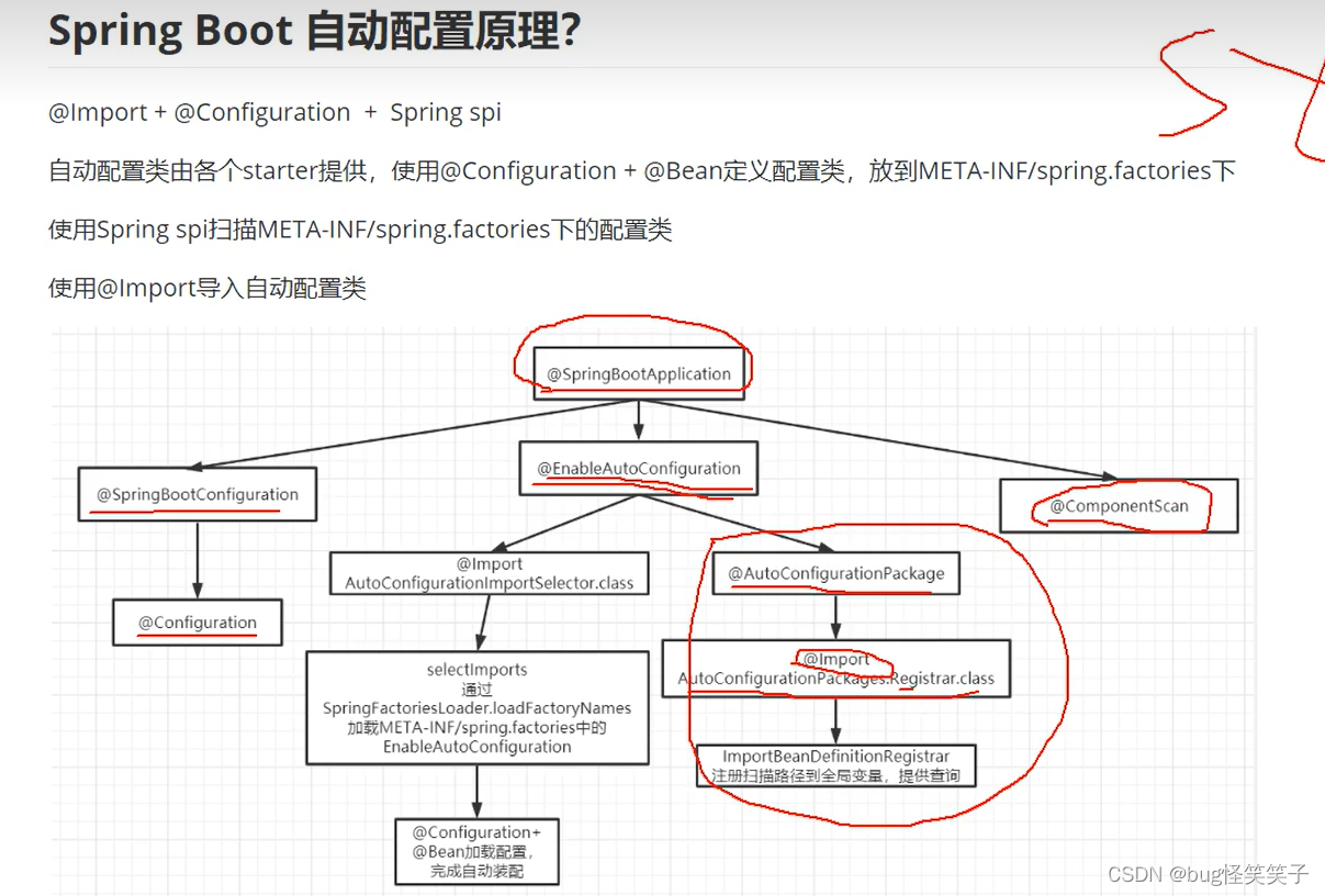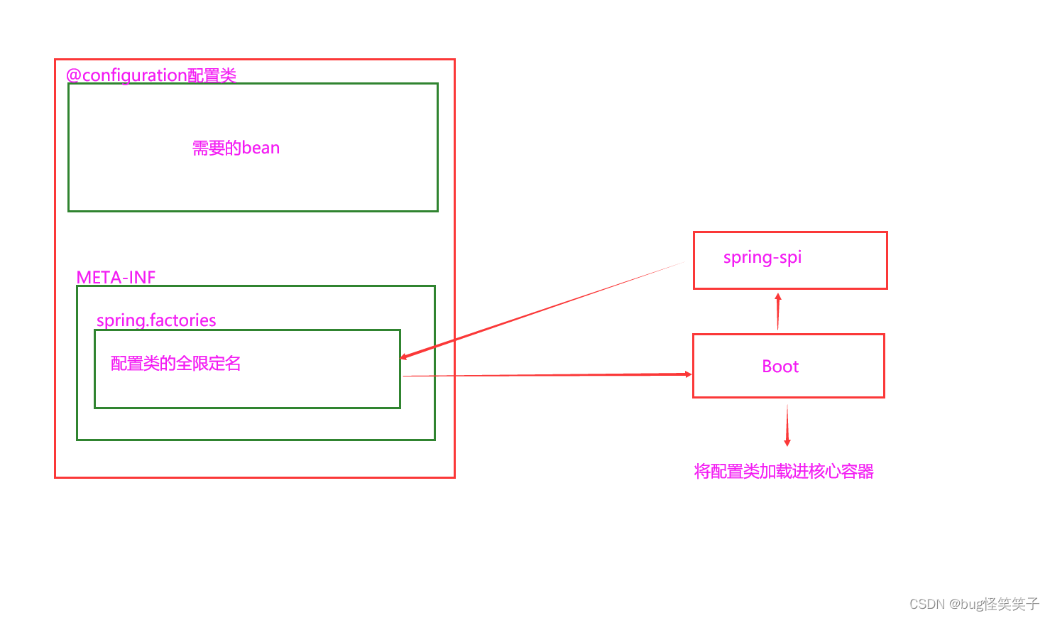首先,自动配置类由各个starter来提供,它使用@Configuration和@bean来定义配置类。并且把配置类的全路径名放进MEAT-INF/spring.factories里。自动配置的核心就是如何加载这些配置类。