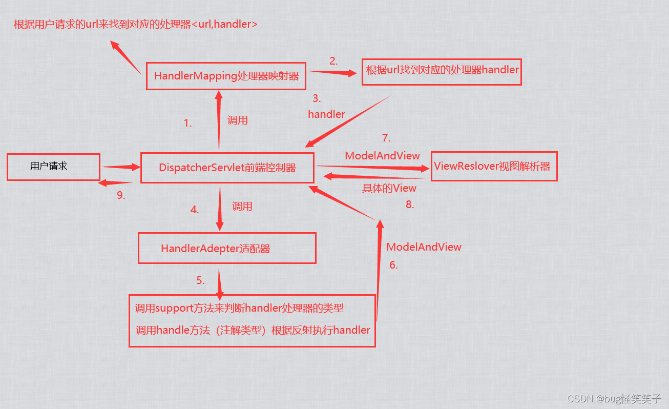 4.DispatcherServlet调用HandlerAdpater适配器,适配器来首先调用Support方法来确定handler是什么类型的,举例如果是注解类型,调用handle方法使用反射执行handler。并返回给DispatcherServlet一个ModelAndView。