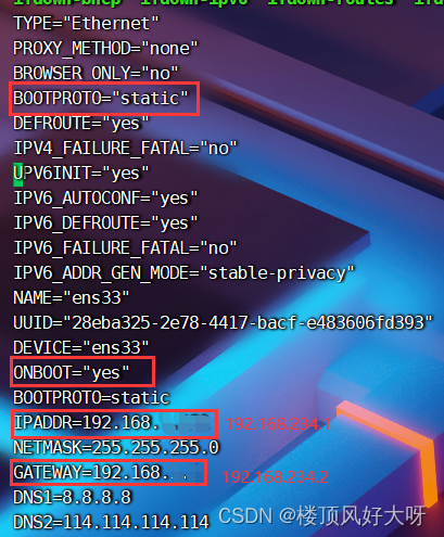 5.通过 vi /ifcfg-ens33 来更改配置文件(可能配置文件名会不一样)