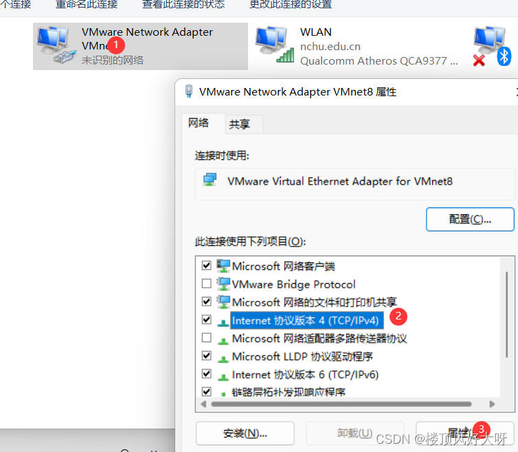 1、在控制面板---》网络和Internet---》更多适配器选项中找到 VMware Network Adapter VMnet8,查看属性找到 IPV4 并点击其属性