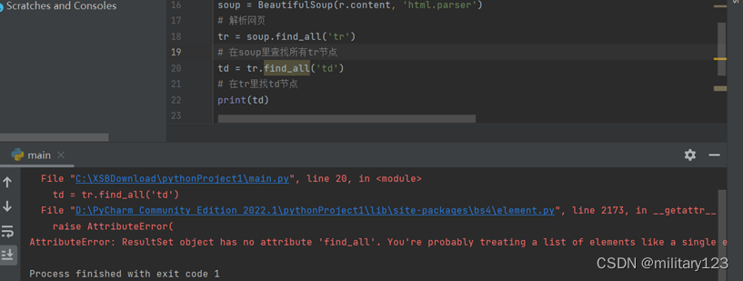 - 报错是因为找出来的tr节点不止一个,无法一次性找出所有td节点,所以需要循环遍历tr,输出其中的文字内容。通过查找,了解到HTML 的<td>标签中有一个abbr属性的值为text文本,即需要爬取的目标数据。